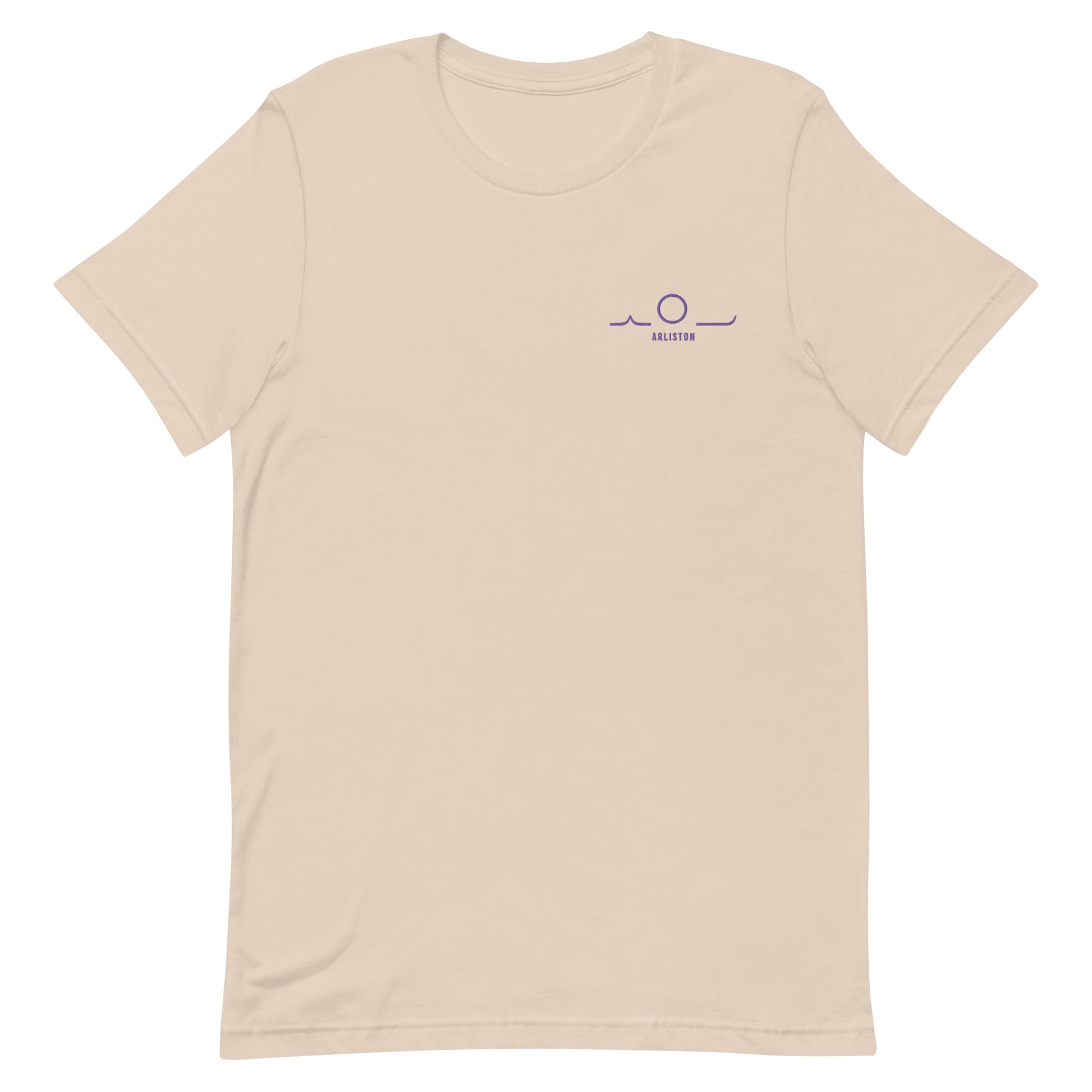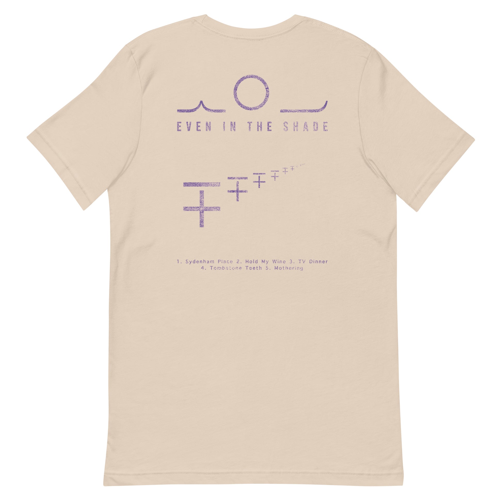 Arliston T featuring an embroidered logo on the front and on the back, the symbols and tracklist of the 'Even in the shade' EP