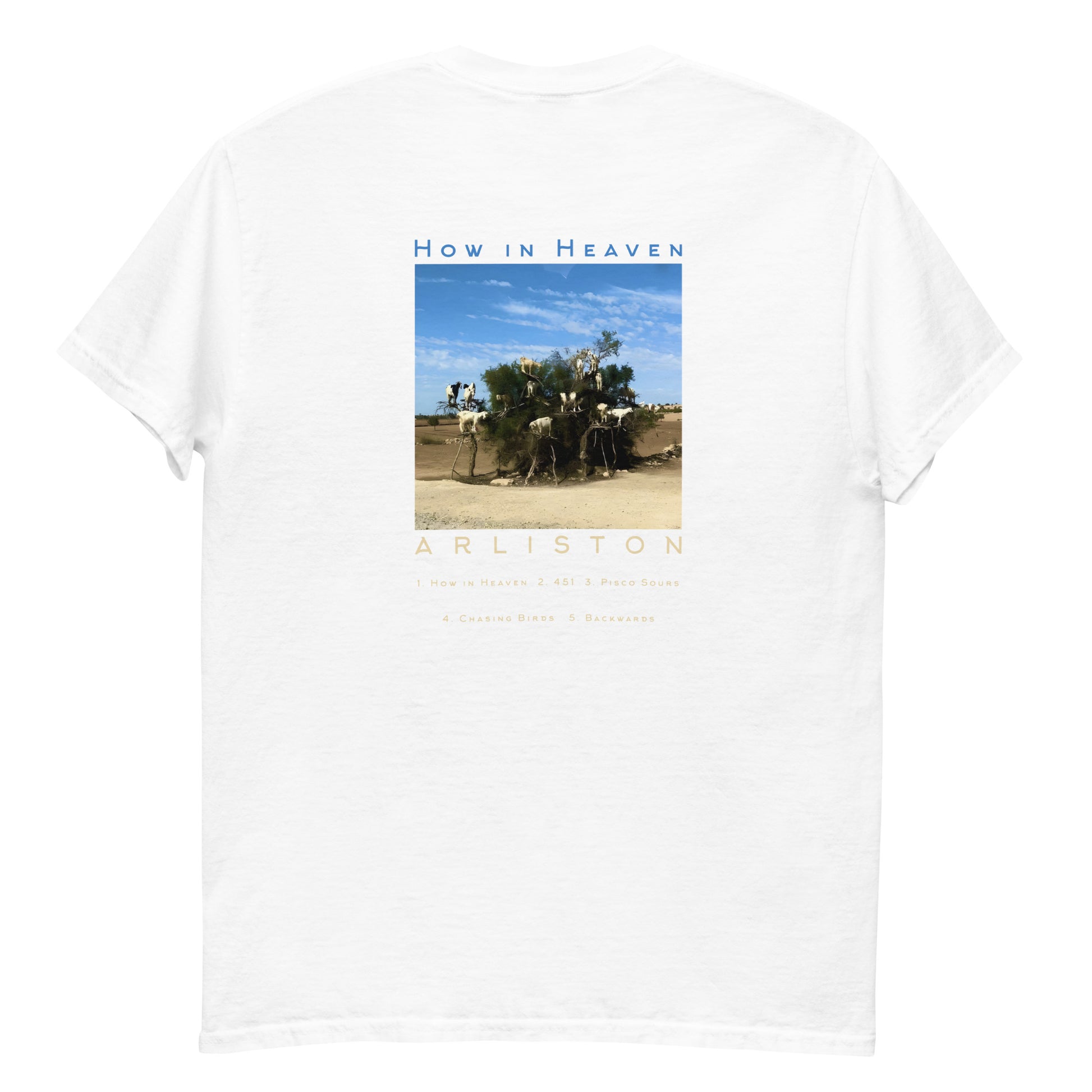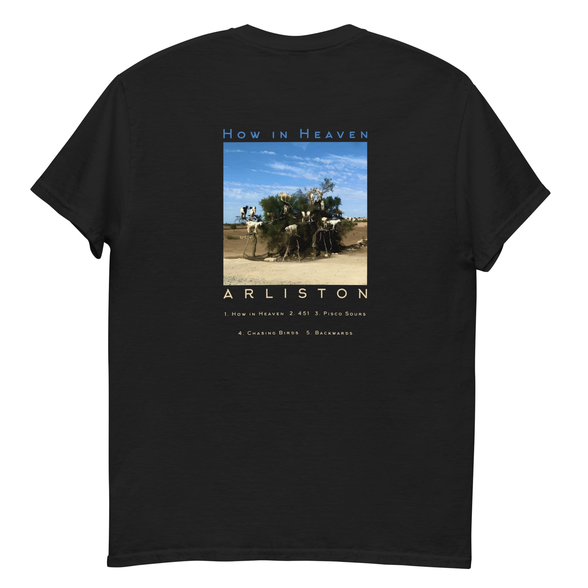 T-shirt featuring the Artwork and track list of Arlistons "How in Heaven" EP